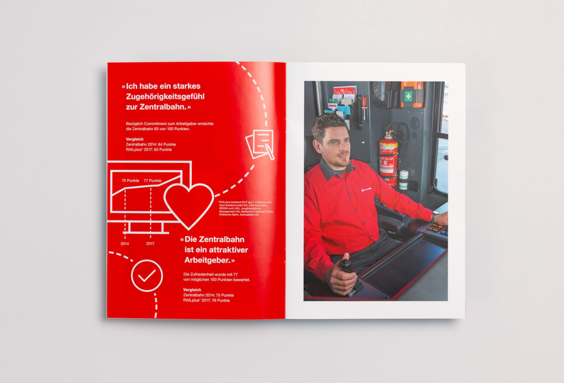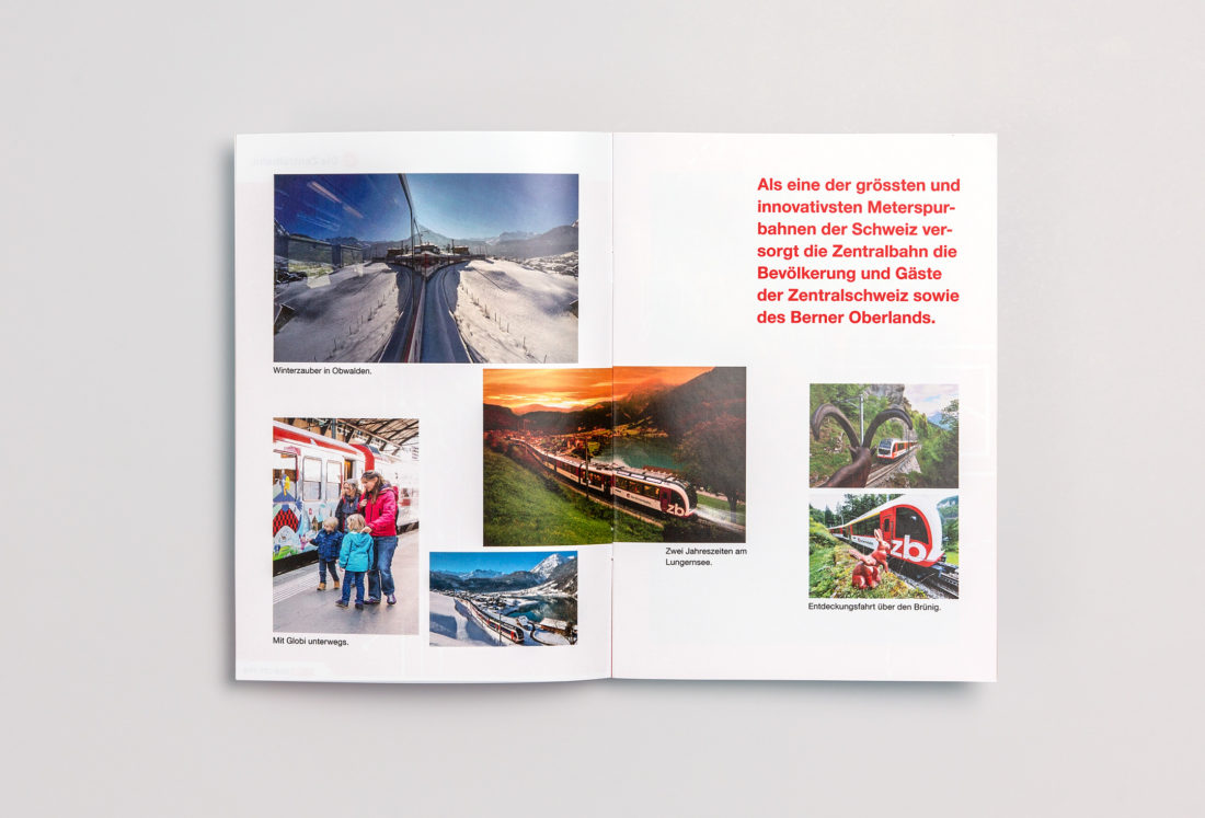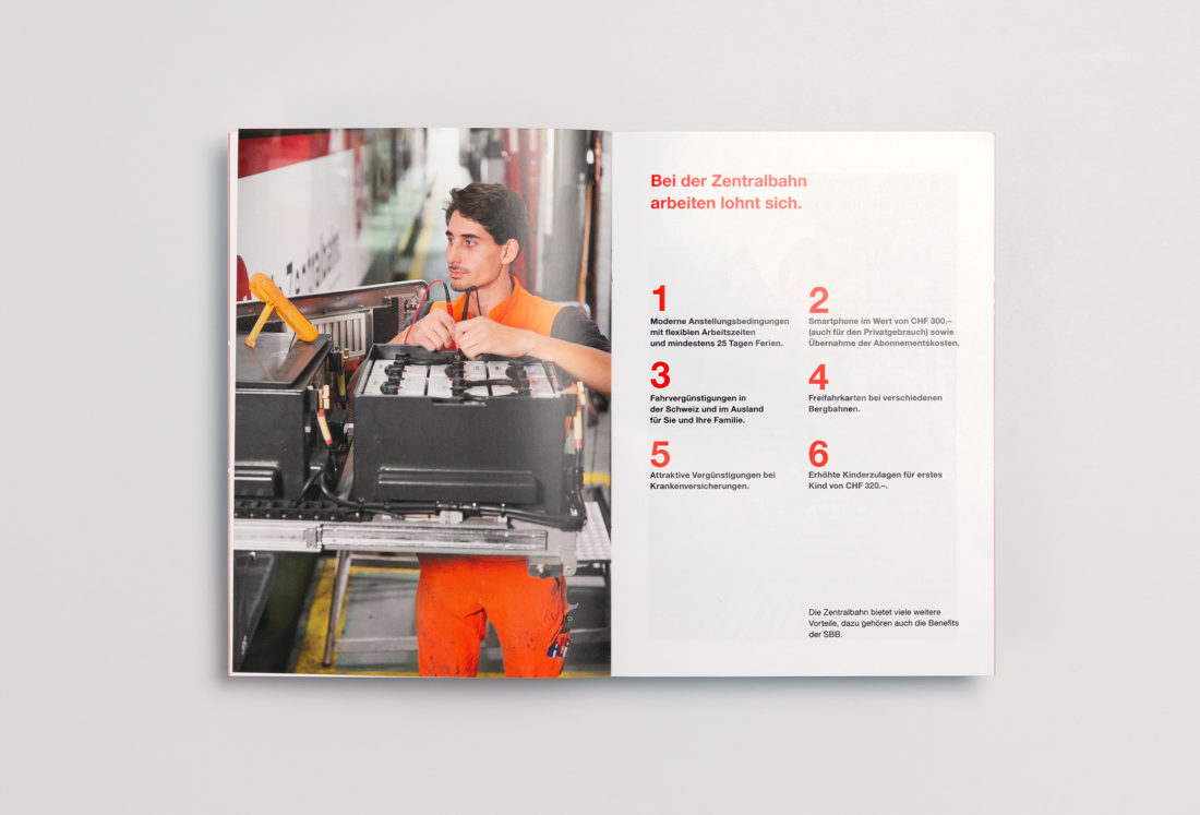 Die zb Zentralbahn AG wurde schon mehrfach als attraktiver Arbeitgeber ausgezeichnet. Um die Vorzüge der SBB-Tochter kompakt und knackig zu präsentieren, durften wir eine neue zwanzigseitige Broschüre konzipieren und umsetzen. Plakative Textseiten und diverse Bildwelten porträtieren so den sympathischen Arbeitgeber aus Stansstad.