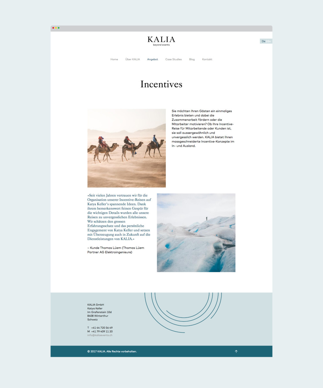 McKinivan wurde mit der Entwicklung und Gestaltung der Unternehmensidentität von KALIA beauftragt. KALIA, gegründet von Katya Keller, ist spezialisiert auf Events sowie die Incentive und Travel Branche. Von der Namensgebung über das Logo bis zu verschiedenen Anwendungen strahlt das ganze Erscheinungsbild Professionalität und Leidenschaft aus. Der visuelle Auftritt aus stimmigen Bildwelten und spannender Typographie wurde sowohl auf den Visitenkarten wie auch der Webseite entsprechend in Szene gesetzt.
