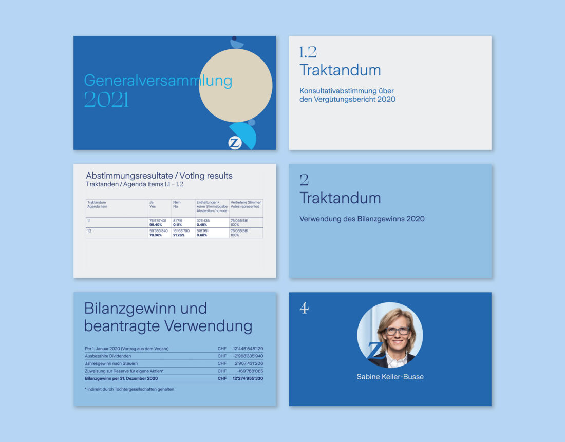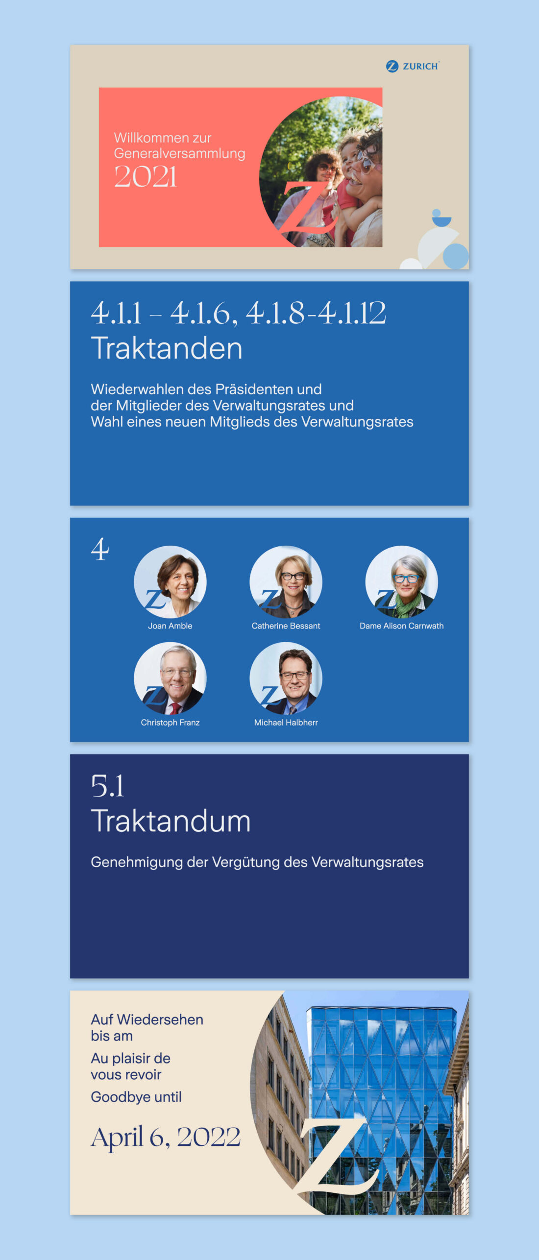 Während sonst knapp 2000 Zuschauer vor Ort im Hallenstadion dabei sind, konnte man dieses Jahr die Personen vor Ort an einer Hand abzählen. Die Zurich Insurance Group GV wurde nämlich aus dem Zurich Development Center am Zürichberg per Webcast in die Welt gestreamt. Mit diversen vorproduzierten digitalen Inhalten gestalteten wir eine ansprechende und abwechslungreiche GV von knapp 1.5 Stunden. Dabei integrierten wir die neue, erfrischende Unternehmensidentät von Zurich in sämtliche digitale und analoge Massnahmen wie die Streaming-Plattform, Ablauffolien, Jingles, Videos und die Gestaltung des GV-Saals.