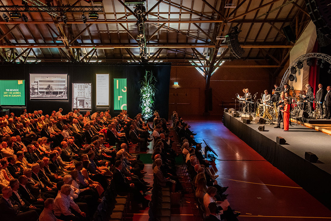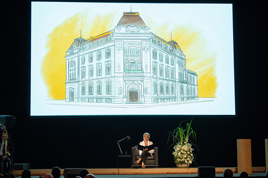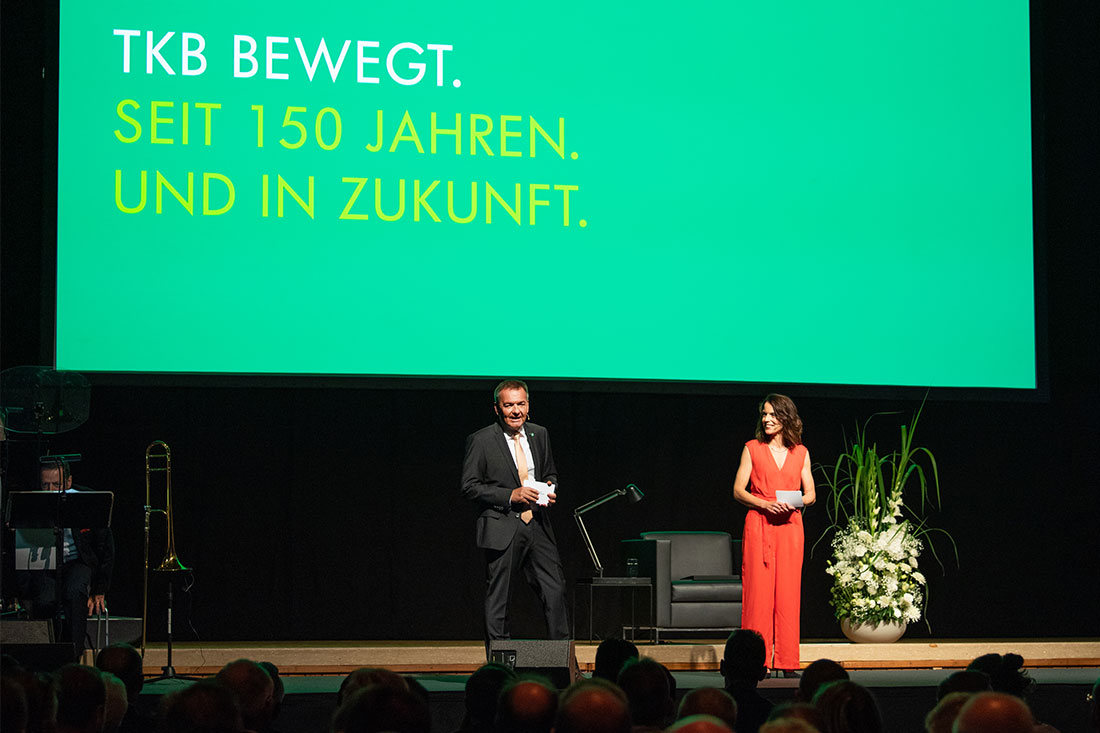 Mit einem spannenden und abwechslungsreichen Abendprogramm nahm Moderatorin Mona Vetsch die geladenen Gäste aus der Region und der Wirtschaft auf eine Zeitreise in die 150-jährige Geschichte der TKB. Für den Jubiläumsanlass produzierten wir einen illustrierten Animationsfilm, gespickt mit diversen Anekdoten. Da sich die Suche nach Bildmaterial als schwierig gestaltete, wurden viele Szenen mit Hilfe historischer Recherche zeichnerisch aufbereitet. Am Anlass erzählte dann Schauspielerin Heidi Maria Glössner – parallel zur laufenden Animation – die 150-jährige Geschichte der Bank. Zwei Gesprächsrunden mit Zeitzeugen und Kennern der Bankgeschichte rundeten den Blick in die Vergangenheit ab.