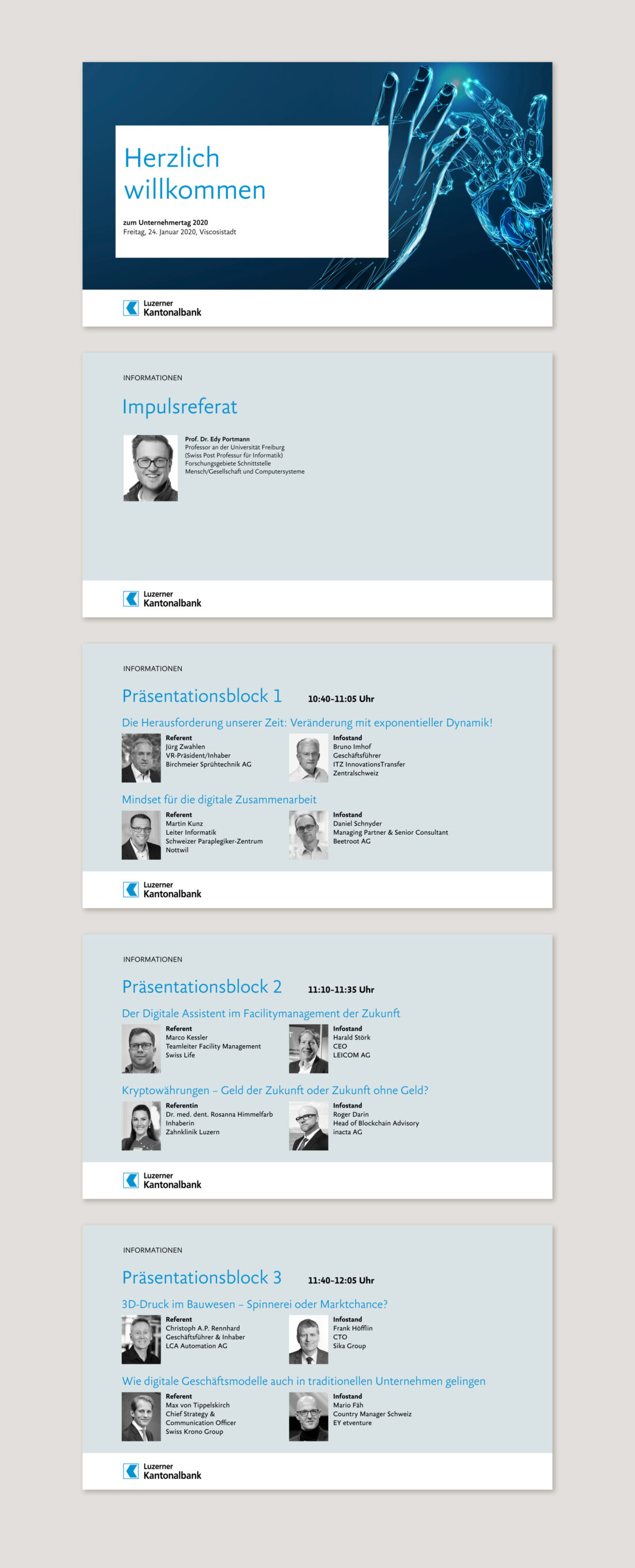 Mit einem spannenenden und abwechslungreichen Tagungskonzept, bestehend aus Impulsreferat, Praxiseinblicken und Infoständen, präsentierte die LUKB ihren Gästen eine Reihe Lösungsansätze zum Thema On/Off – Erfolg dank Technologie und Mensch. Vertreter von Unternehmen und Organisationen zeigten dabei – ganz aus der Praxis heraus – wie ihre Projekte zwischen «on» und «off», also zwischen Technologie und Mensch, entwickelt, umgesetzt und betrieben werden. Mit einem unterhaltenden und zum Thema passenden Poetry Slam Beitrag von Dominik Muheim sowie einem Tagesrückblick wurde der Unternehmertag abgerundet.