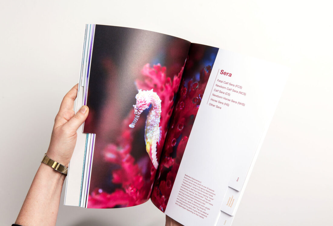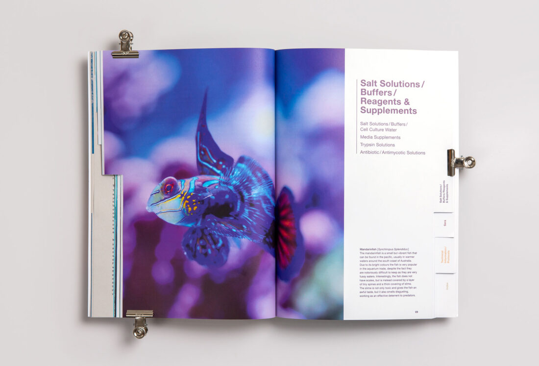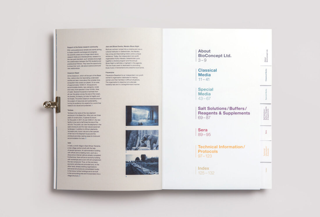 Für BioConcept, den Basler Hersteller von Zellkulturen, haben wir den umfassenden Produktkatalog überarbeitet und neu gestaltet. Als Highlights zeigen sich ein neu entwickelter Imageteil sowie gestanzte Register, um eine optimale und einfache Suche nach Produkten zu gewährleisten. Weiter sorgt ein neues Farbkonzept und farbintensive Bilder aus der Unterwasserwelt für Abwechslung auf den 132 Seiten.