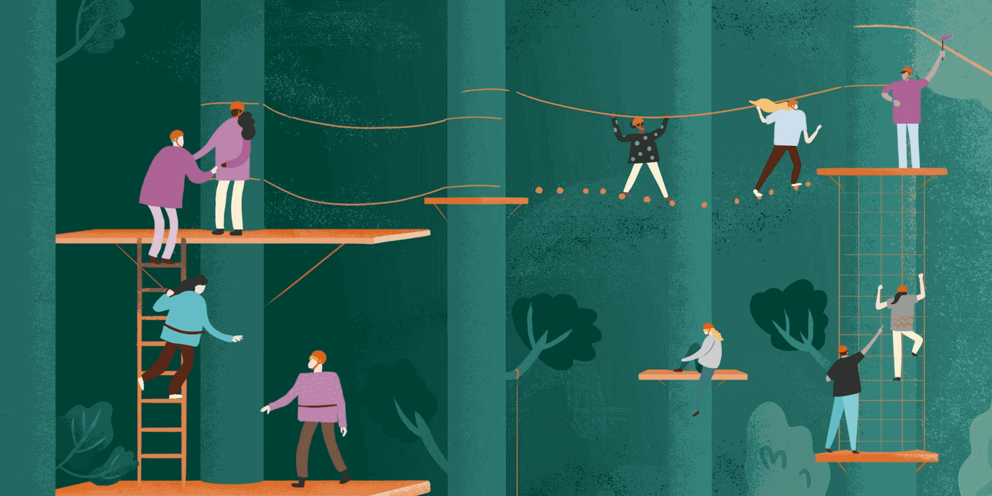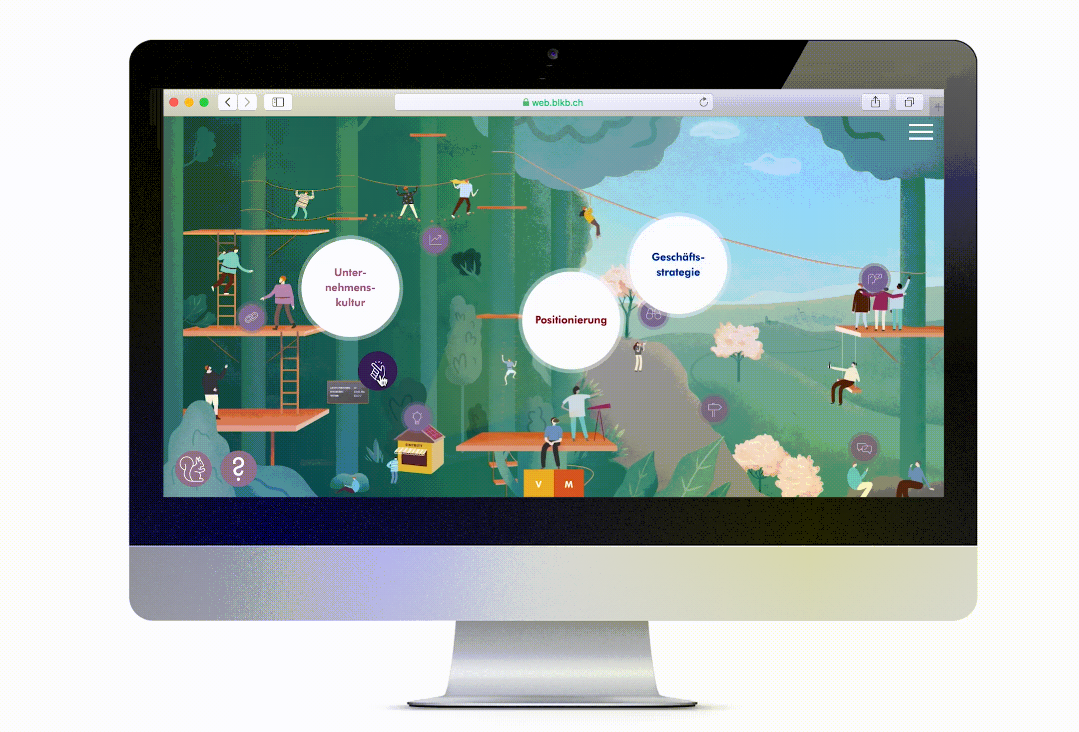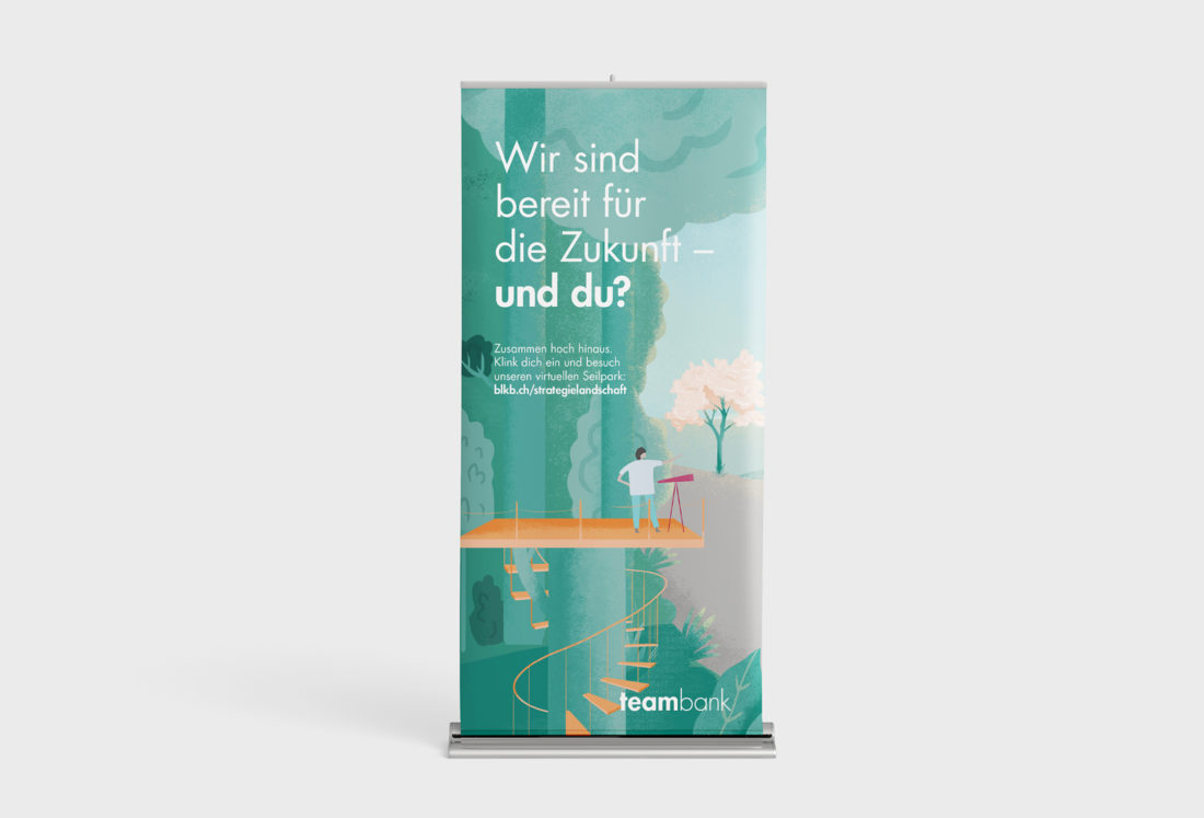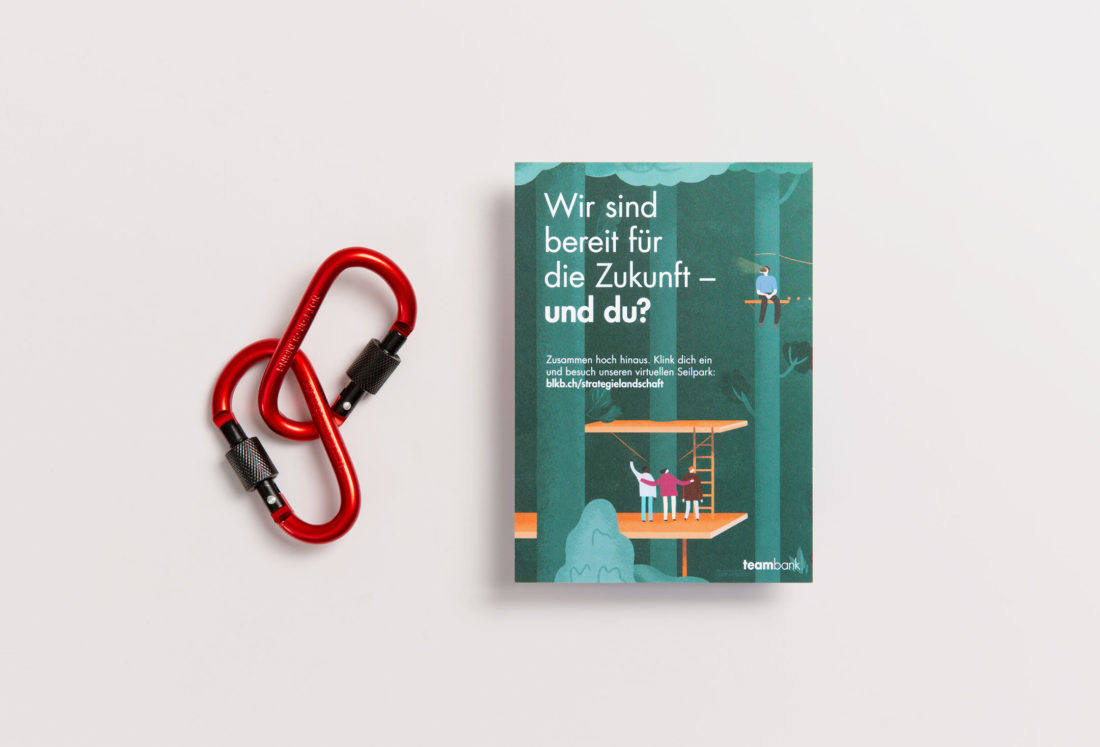 Die Basellandschaftlichen Kantonalbank ist in Bewegung und hatte zum Ziel, die neue Unternehmensstrategie auf spielerische und agile Art und Weise intern zu kommunizieren. Dafür haben wir ein interaktives Online-Tool konzipiert, das bei den Mitarbeitenden Neugier wecken soll. Wir kreierten einen virtuellen Seilpark, der die Werte der Bank widerspiegelt und die Botschaften lebhaft entdecken lässt – ganz nach dem Motto «Zusammen hoch hinaus. Klink dich ein!». Parallel zu dieser digitalen Entdeckungsfläche entwickelten wir zahlreiche analoge Kommunikationsmassnahmen.