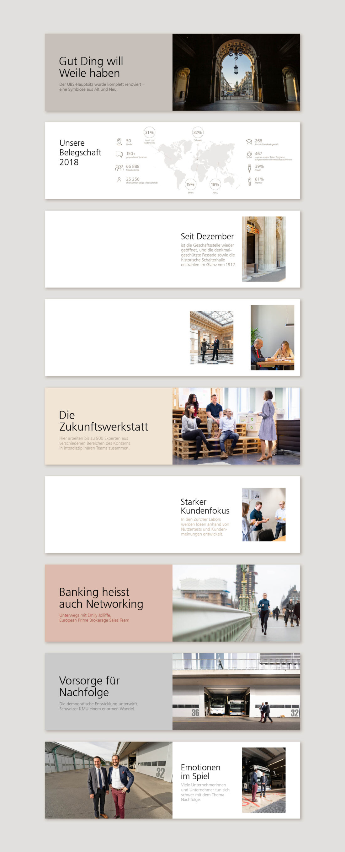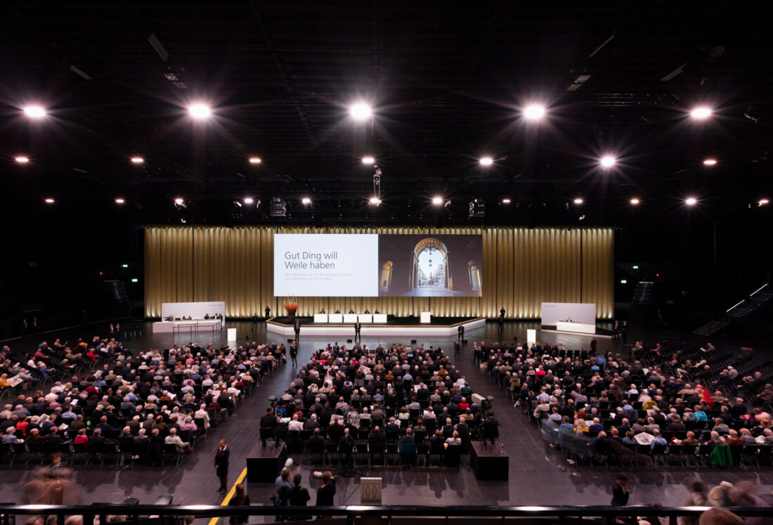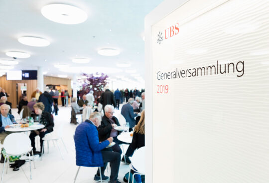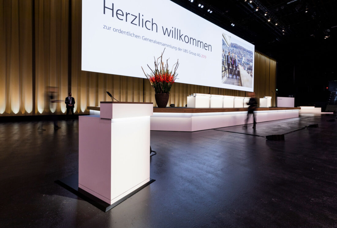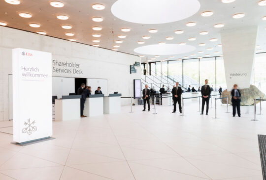 Die UBS lud ihre Aktionäre zur diesjährigen Generalversammlung in die umgebaute St. Jakobshalle in Basel ein. Neue Location, neue Herausforderungen: Ein gradliniges und einnehmendes Bühnendesign, ein klares Signaletikkonzept, stilvolle Brand Experience bis hin zu unterhaltsamen und informativen Inhalten auf der Leinwand sorgten für eine stimmige Generalversammlung. Unter dem Motto «Gemeinsam stärker» präsentierte die digitale Wartezeitanimation den über 1’200 Besuchern aktuelle Geschichten aus dem Alltag der internationalen Grossbank.