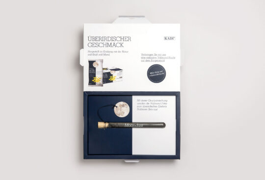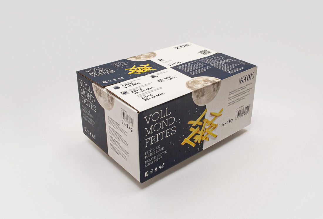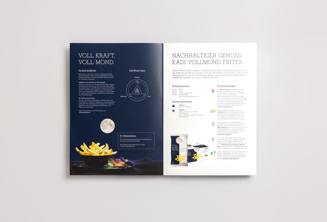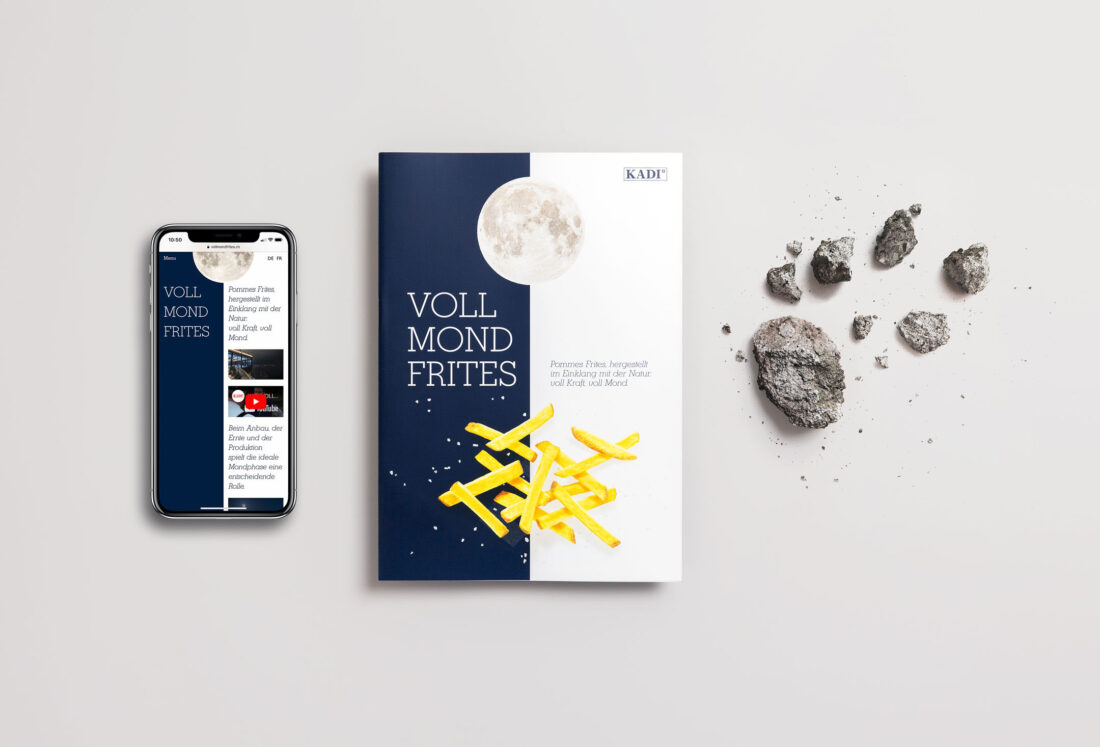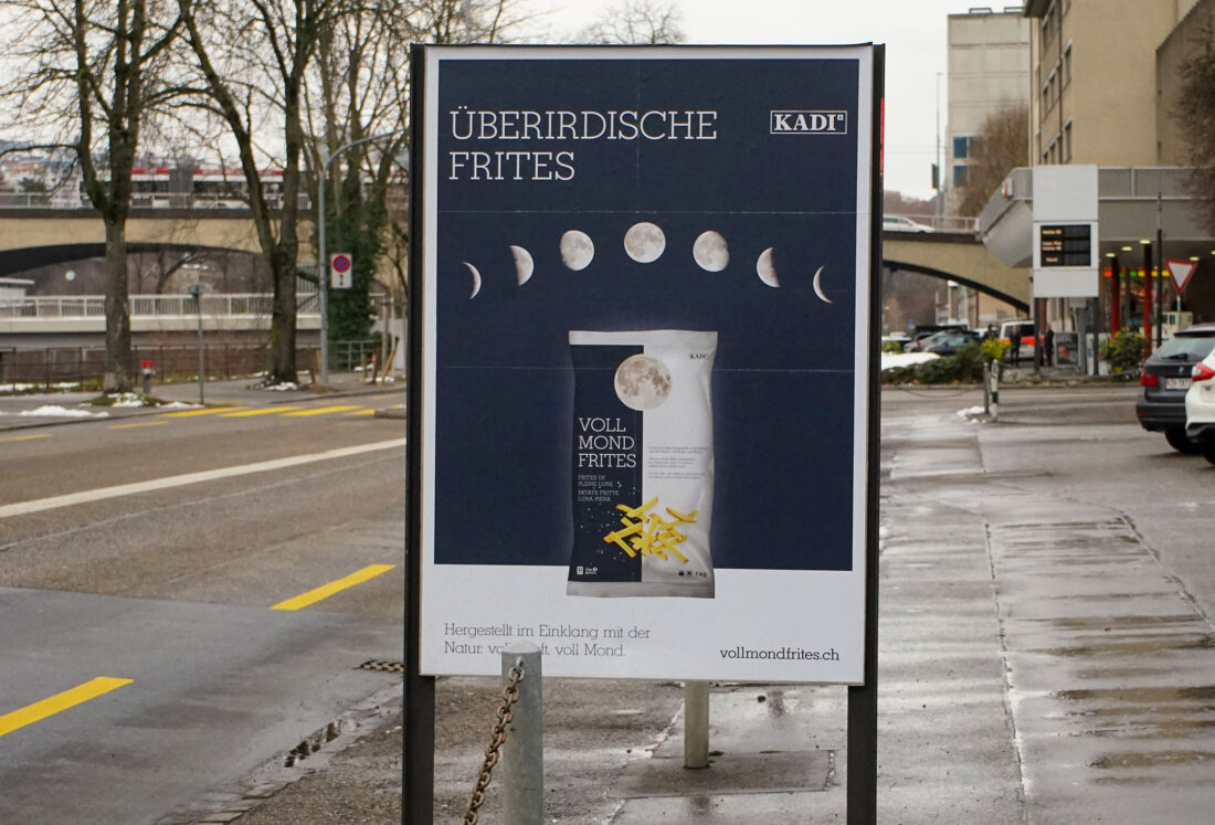Anlässlich eines Pitchs konnten wir KADI bereits im Vorfeld mit unseren Ideen zur Produktpräsentation und -kommunikation überzeugen. So durften wir anschliessend für die Produktlancierung sämtliche Verpackungen und Kommunikationsmassnahmen entwickeln und gestalten. Dazu gehörten eine Webseite, ein innovatives Kundenmailing, diverse Teaser- und Lancierungs-Inserate sowie Webbanner, Plakatkampagnen, einen Produktefolder, einen Mondkalender und verschiedene Promotionsartikel. Weiter konzipierten wir einen kurzen Produktclip zum neuen Vollmond Frites, der zeitgleich mit der Lancierung veröffentlicht wurde.